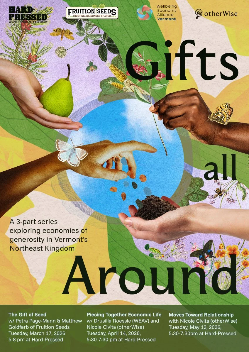 For their event series, all about economies of generosity, I wanted to create a poster design that illustrates the notion of the circle of the gift, with people passing around contributions. Taken together, they resemble the growth from seed into fruit. Assisted by our more-than-human companions — perhaps our most overlooked gifts! And from this gift circle, a new horizon opens up: the possibility for abundant, thriving futures.